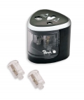 Peach elektrischer universal Anspitzer schwarz | inkl. Ersatzteile | für alle Bleistifte, Buntstifte, Eyeliner und Wachsmalstifte | Doppelspitzer für Stifte von 6-8 mm und 9-12 mm | PO102